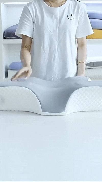 • Woman relaxing with gray Reading Comfort Pillow by getblissyneck supporting her back and neck